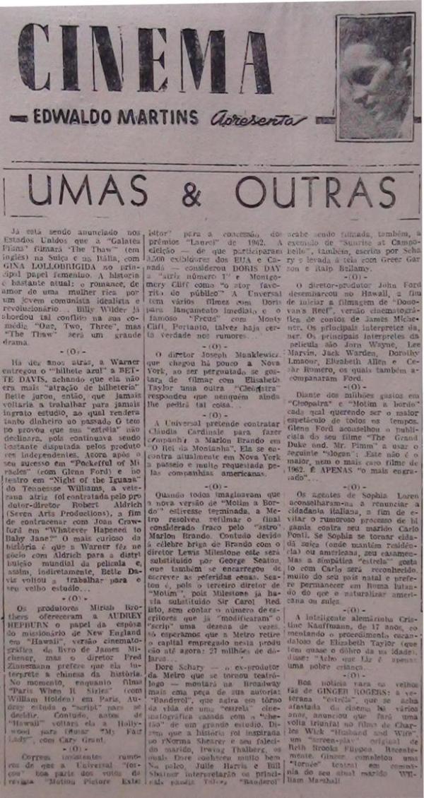 Cheguei a fazer vários programas. Junto com o Acyr Castro, por exemplo, fiz o “Tele Cine”, um programa semanal sobre cinema. Fiz também “Quatro Ases e Uma Dama”. Eram quatro apresentadores que se reuniam para entrevistar uma mulher. Trabalhavam nesse programa, além de mim, o José Maia, o Orlando Carneiro, o Ivo Amaral e o Abílio Couceiro. Participei também de um programa chamado “Só Às Quintas”, que era na linha de shows e variedades. Nessa altura, eu tinha na “Província” uma página em que eu só tratava de mulheres. Então, minha participação no “Só Às Quintas” era dar notícias sobre mulheres. Fiz também um programa chamado “Edwaldo Martins”, que eu inicialmente apresentei sozinho e depois junto com a Sônia Ohana. Ela era, na época, uma das moças mais badaladas de Belém. Foi concorrente a Rainha do Carnaval, foi Miss Pará e chegou a ser Miss Brasil número 3. Era uma moça muito conhecida e muito simpática, e apresentou esse programa junto comigo por muito tempo. E tive também um programa chamado “Weekend”, que era aos sábados.