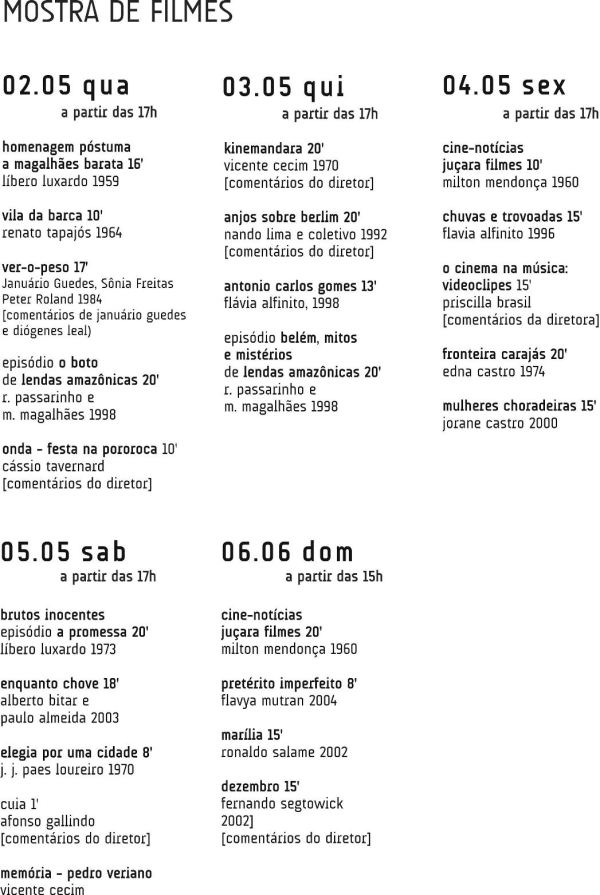 Concomitante à exposição será exibida uma mostra de filmes que fizeram a história do cinema e do audiovisual no Pará. De 02 a 06 de maio no Cine Líbero Luxardo a partir das 17h uma programação comentadas pelos realizadores como Cássio Tavernard, Priscilla Brasil, Fernando Segtowick, Vicente Cecim, Nando Lima, Januário Guedes e Afonso Gallindo. A mostra de filmes tem curadoria de Ramiro Quaresma.