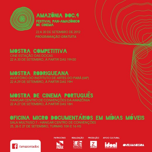 De 21 à 30/09, dentro das atividades da XVI Feira Pan – Amazônica do Livro, promovida pela SECULT, acontecerá a 4ª Edição do Festival Amazônia Doc. Este ano, além da parte competitiva, acontecerá a exibição de uma mostra de filmes baseados na obra do escritor Nelson Rodrigues e uma mostra de filmes portugueses. A curadoria do festival ficou sob a responsabilidade de Zienhe Castro (diretora e idealizadora do festival), Manoel Leite Jr. e Marco Antonio Moreira (agradeço o convite para participar desta curadoria). Confira programação completa: