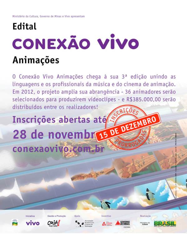 Animadores, cineastas e designers tem mais tempo para se inscreverem no Edital Conexão Vivo Animações. As inscrições foram prorrogadas até o dia 15 de dezembro. O edital é uma ação para estimular a produção de obras de animação, explorando a interface entre música e imagem, em suas diferentes possibilidades de linguagem. Ao todo, 36 candidatos serão contemplados com R$360 mil para produção de um videoclipe de animação inédito para cada uma das 36 músicas de artistas e bandas selecionadas pelo Conexão Vivo. A lista de artistas e músicas que vão receber os novos videoclipes também foi divulgada. Entre eles, estão BNegão e os Seletores de Frequência (RJ),Marcelo Jeneci (SP), Cabruera (PB), Thiago Pethit (SP), Nina Becker (RJ), Bixiga 70 (SP), Lucas Santtana (BA), Felipe Cordeiro (PA), Eddie (PE) e Lia Sophia (PA). Além do orçamento para realização dos clipes, os animadores ainda concorrem a R$25 mil em prêmios para os melhores clipes, que serão escolhidos pela curadoria e por votação popular. A lista completa das músicas selecionadas e as inscrições estão disponíveis no portal Conexão Vivo