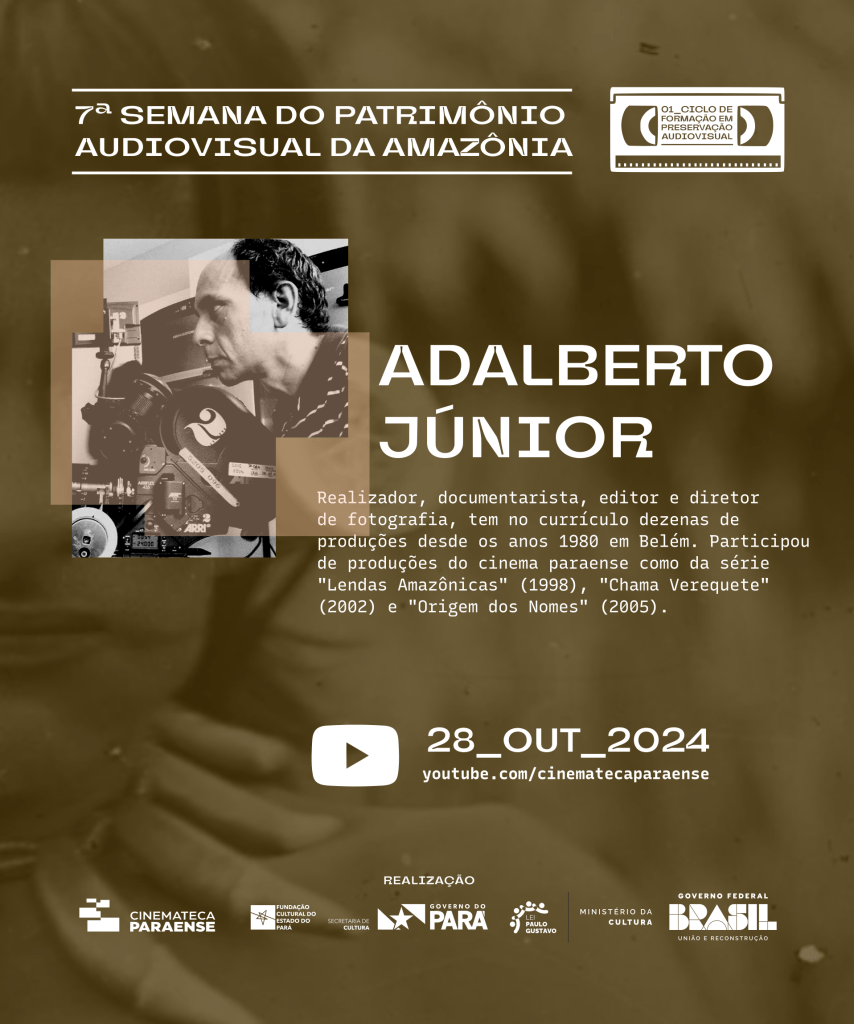 Adalberto Júnior é realizador, documentarista, editor e diretor de fotografia, tem no currículo dezenas de produções desde os anos 1980 em Belém. Participou de produções do cinema paraense como da série “Lendas Amazônicas” (1998), “Chama Verequete” (2002) e “Origem dos Nomes” (2005). Nos anos 1980 foi videomaker independente e fez registros únicos da cena cultural de Belém, e foi assistente de câmera de produções internacionais que passaram pelo Pará no período.