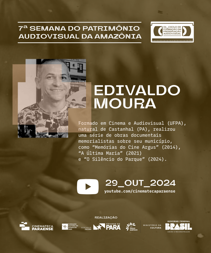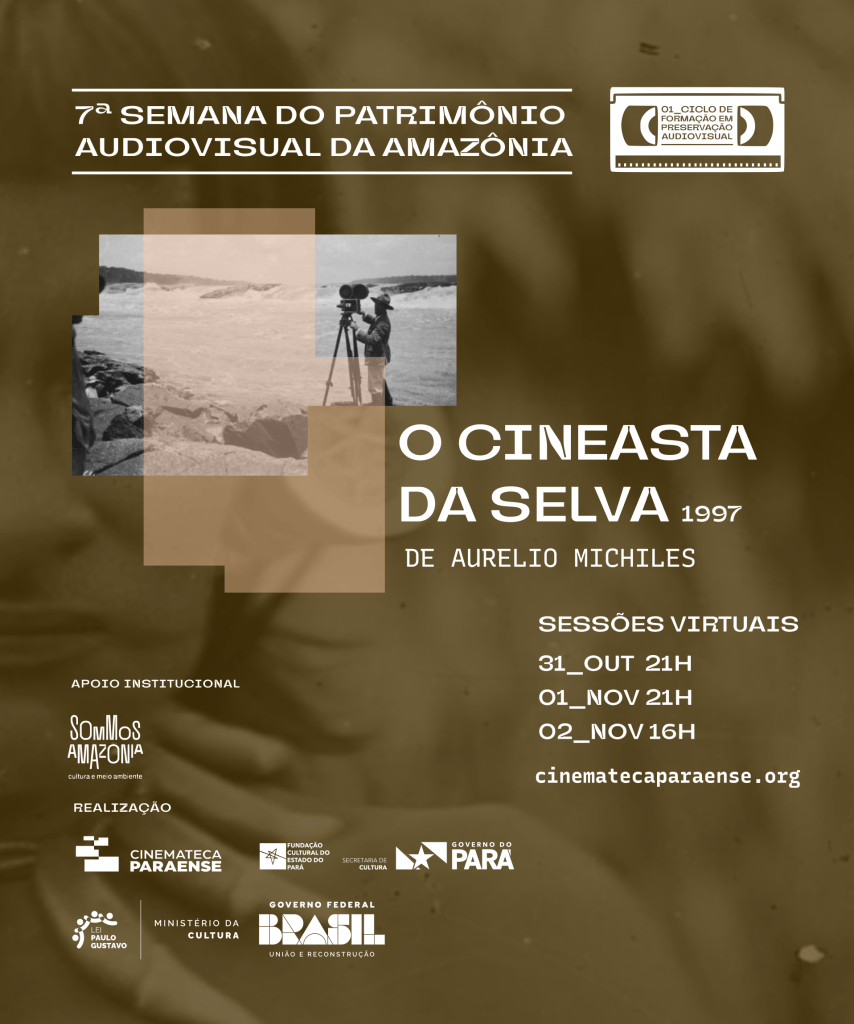 O dia 27 de outubro celebra o dia internacional do patrimônio audiovisual, uma data para lembrar da importância dos acervos audiovisuais para a memória do mundo. Em alusão a data, em sua sétima edição, a Semana Semana do Patrimônio Audiovisual da Amazônia, realizada desde 2013 pela Cinemateca Paraense, entrevista quatro realizadores amazônidas que capturaram ao longo dos anos imagens deste múltiplo universo imagético e sonoro da nossa região. Como entrevistados convidados teremos os realizadores amazônidas Adalberto Júnior, Edivaldo Moura, Fernanda Brito Gaia e Aurelio Michiles. A Semana também tem a honra de exibir “O cineasta da selva” (1997) de Michiles, atualmente fora de streamings.