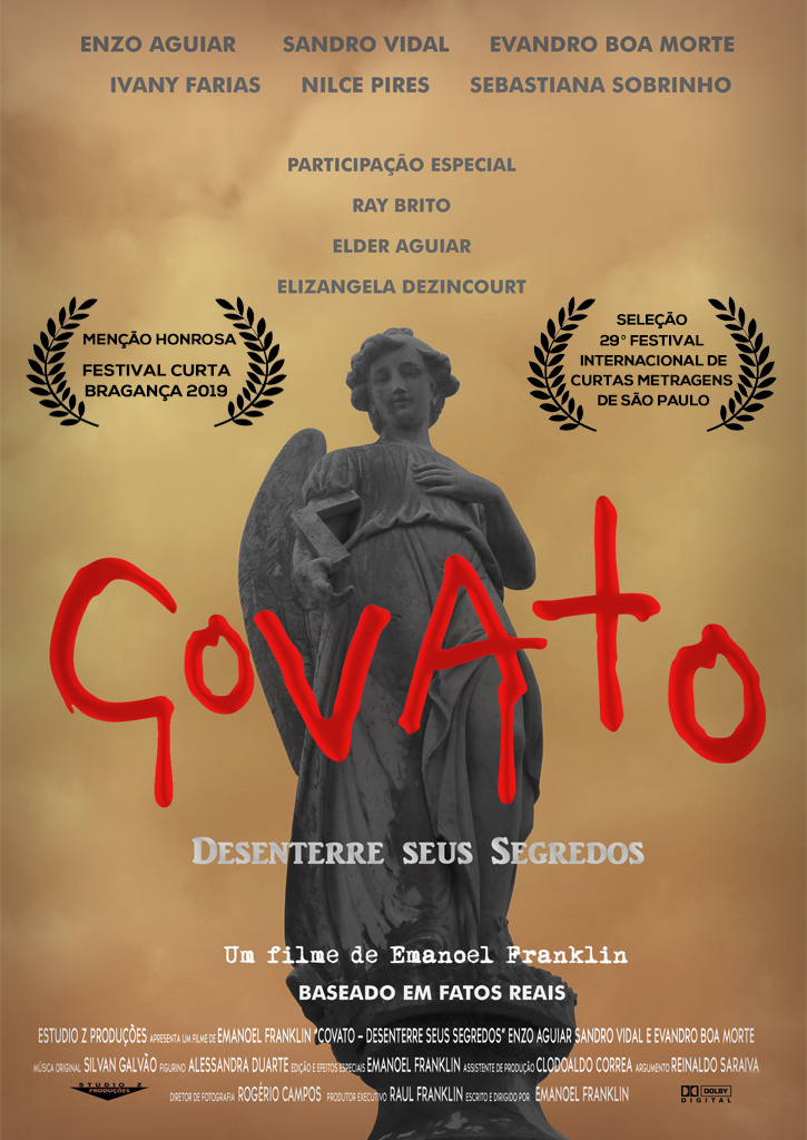 COVATO – Desenterre seus Segredos. Direção, Roteiro e Edição: Emanoel Franklin. Argumento: Reinaldo Saraiva. Produção executiva: Raul Loureiro. Fotografia: Rogerio Campos. Música: Ray Brito – Os Hippies. Som direto: Hélio Reis. Assistentes de produção: Raider Figueira, Vinícius Villare. Produção: Studio Z Produções. Elenco: Enzo Aguiar, Evandro Boa Morte, Sandro Vidal, Elizangela Dezincourt, Elder Aguiar, Ray Brito, Andria Lopes. 2018. 17 min. Santarém-PA. Cor. Son.